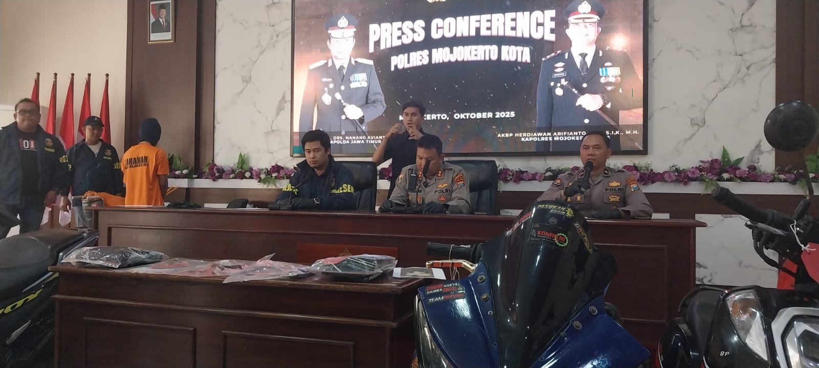Kapolres Mojokerto AKBP Herdiawan Arifianto, S.H., S.I.K., M.H. menjelaskan, bermula saat korban memarkirkan kendaraannya di halaman warung kopi “Si Kopi” dengan posisi dikunci stang sekaligus penutup magnet tertutup rapat. Namun saat pagi hari, korban yang hendak menyapu halaman mendapati motor beserta helmnya sudah tidak ada di tempat.