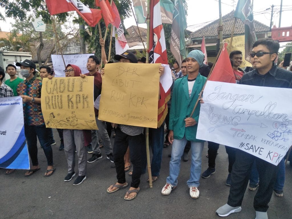 Diketahui, ada empat point tuntutan Mahasiswa Aliansi Jombang, pada Presiden Joko Widodo. 1. Cabut RUU KPK, 2. Menuntut Presiden dan DPR RI untuk segera mencabut RUU KPK yang melemahkan kinerja KPK, 3. Meminta Presiden menerbitkan Perpu terkait pelemahan KPK yang sudah disahkan, 4. Meminta MK mengabulkan judicial review terkait UU KPK yang dirancang sembarangan. (dit)
