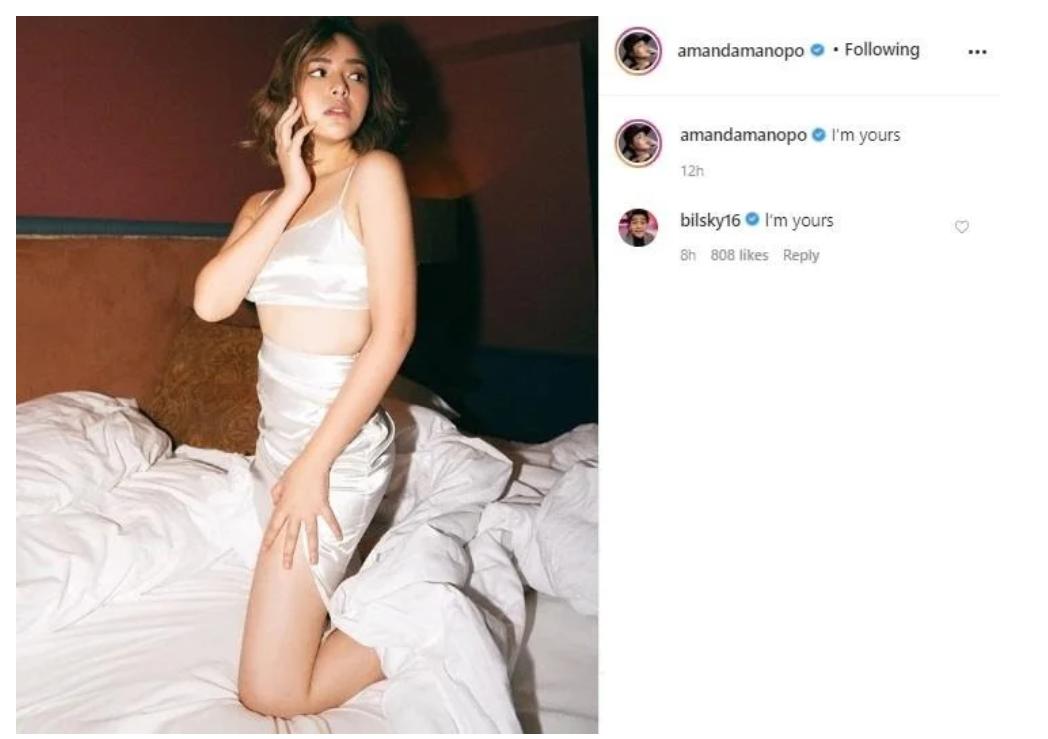 Pose kegita Amanda nampak ia berdiri dengan lutut tangannya memegang leher dan tangan satunya memegang paha. Pada foto itu ia memberi caption “i’m yours”, caption itu membuat netizen bertanya-tanya pada siapa kalimat itu diberikan.