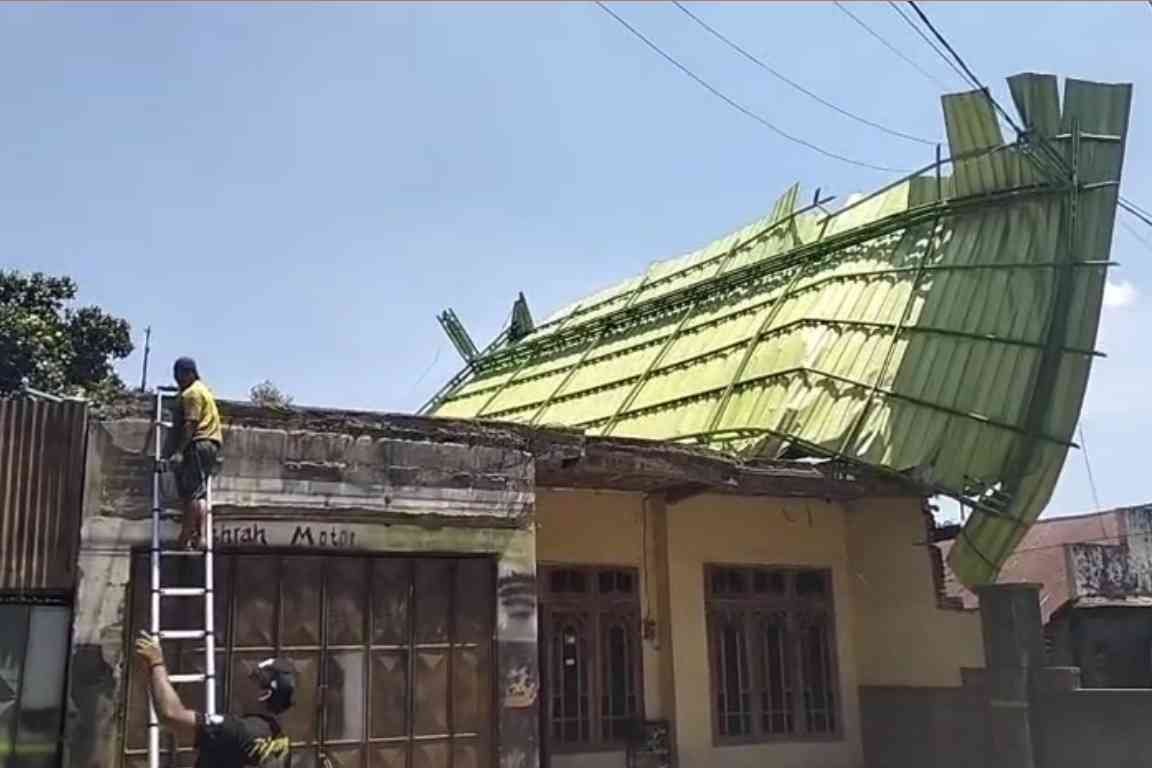 Di Pungging, warga bersama relawan juga bergotong royong membantu evakuasi puing kanopi yang terhempas angin.