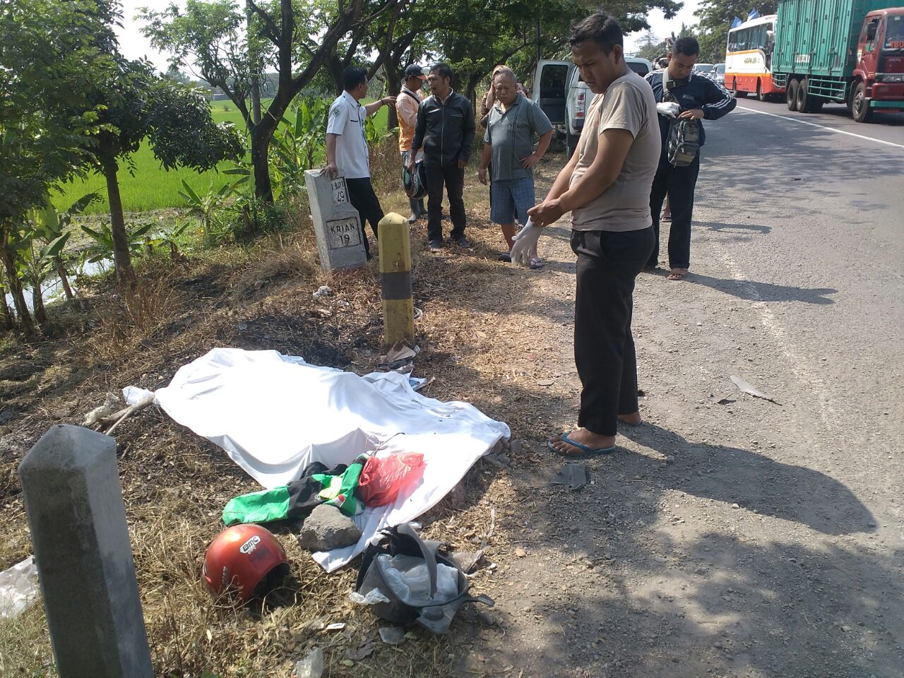 “Korban terseret hingga sejauh 42 meter dan mengalami luka serius pada bagian kepalanya. Akibatnya, ia meninggal di lokasi kejadian,” ujar Kanit Laka Satlantas Polres Mojokerto Ipda Karen kepada wartawan.
