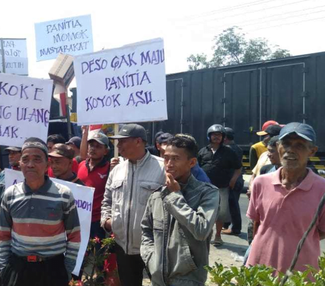 di depan kantor balai desa membentangkan spanduk yang berbunyi deso gak maju panitia koyok asu, pokoke hitung ulang, aku bukan hewan yang selalu kau bodohi dan banyak lagi.