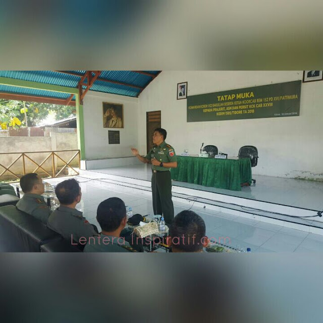 Rombongan kemudian melanjutkan lawatannya ke Makodim 1505/Tidore guna memberikan pengarahan kepada Prajurit TNI dan ASN serta Persit KCK Cabang Dim 1505 Tidore. Dalam kesempatan tersebut Danrem menekankan untuk menghindari segala bentuk pelanggaran termasuk menghindari terjadinya kecelakaan maupun bahaya kebakaran dengan melakukan upaya preventif guna pencegahan.