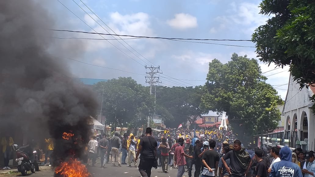 Seperti dilihat oleh media ini, Ribuan mahasiswa yang berunjukrasa, rabu (25/9/2019), akhirnya melempari Mobil Water Canon milik Polres Ternate.