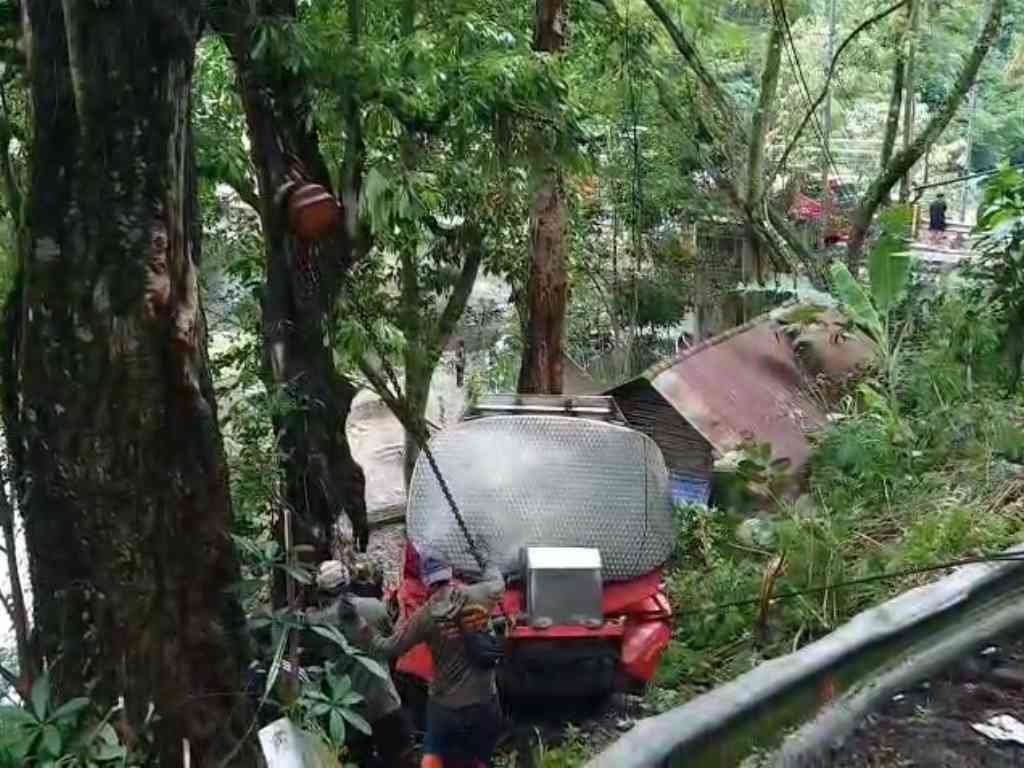 “Kabin depan truk ringsek setelah menabrak pohon. Sopir langsung membanting setir untuk menghindari tabrakan lebih besar dan akhirnya terperosok ke jurang sedalam kurang lebih empat meter,” jelasnya.
