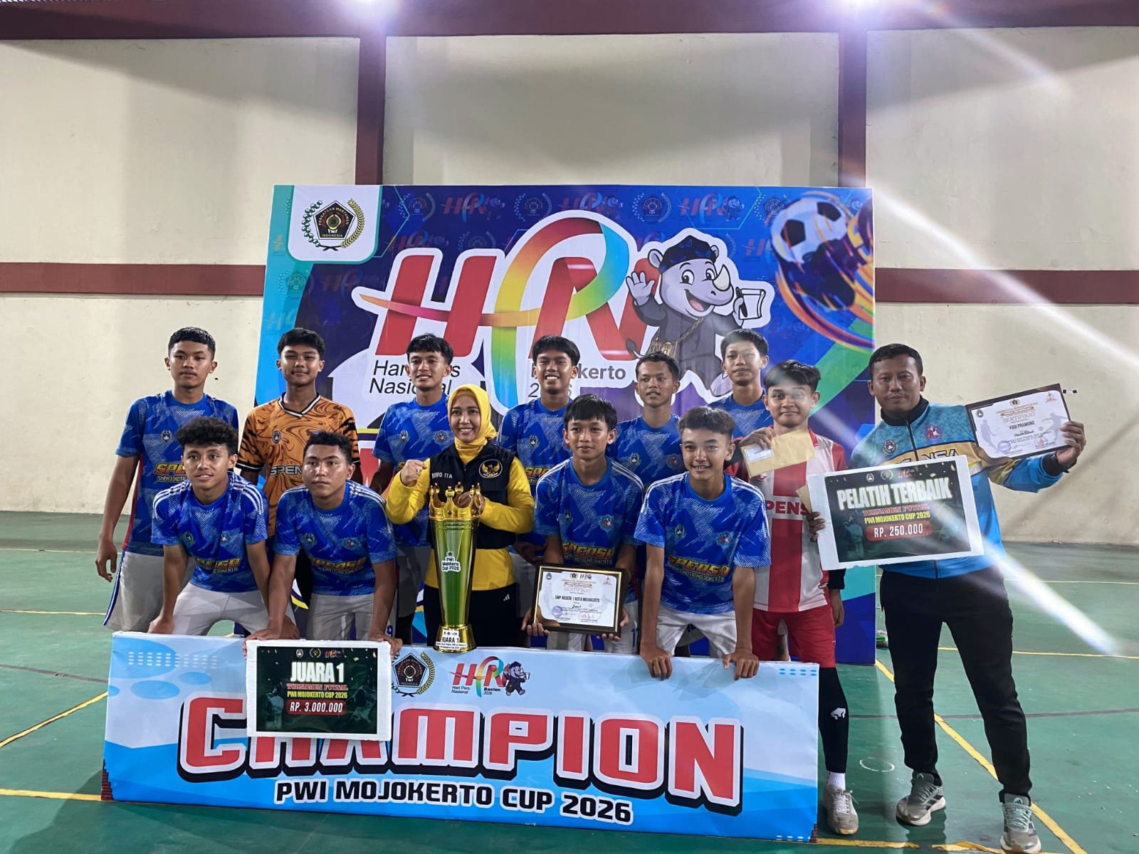 MOJOKERTO, LenteraInspiratif.id– Gemuruh sorak suporter mengiringi sukses SMPN 1 Kota Mojokerto menutup perjalanan manisnya di Turnamen Futsal Pelajar Piala PWI Mojokerto Cup 2026. Pada partai final yang digelar di GOR Seni Majapahit, Jumat (23/1/2026), SMPN 1 Kota Mojokerto memastikan diri sebagai juara usai menundukkan SMPN 9 Kota Mojokerto dengan skor 3–1.