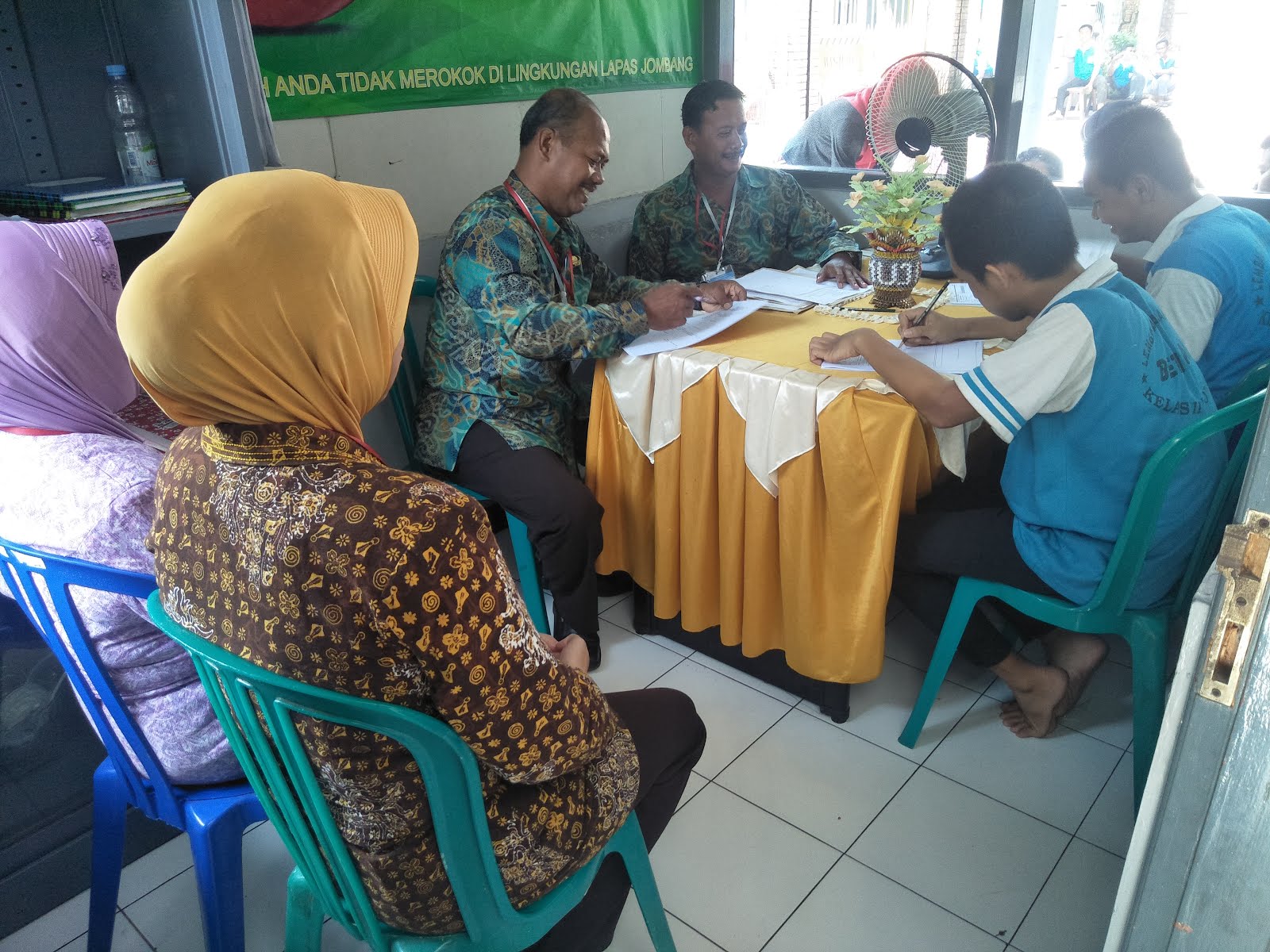 Dua orang pelajar yang berasal dari salah satu Sekolah Menengah Kejuaraan (SMK) dari Kabupaten Jombang, Jawa Timur, sedang menjalani ujian nasional berbasis komputer (UNBK) didalam lembaga permasyarakatan (Lapas) Kelas II-B.