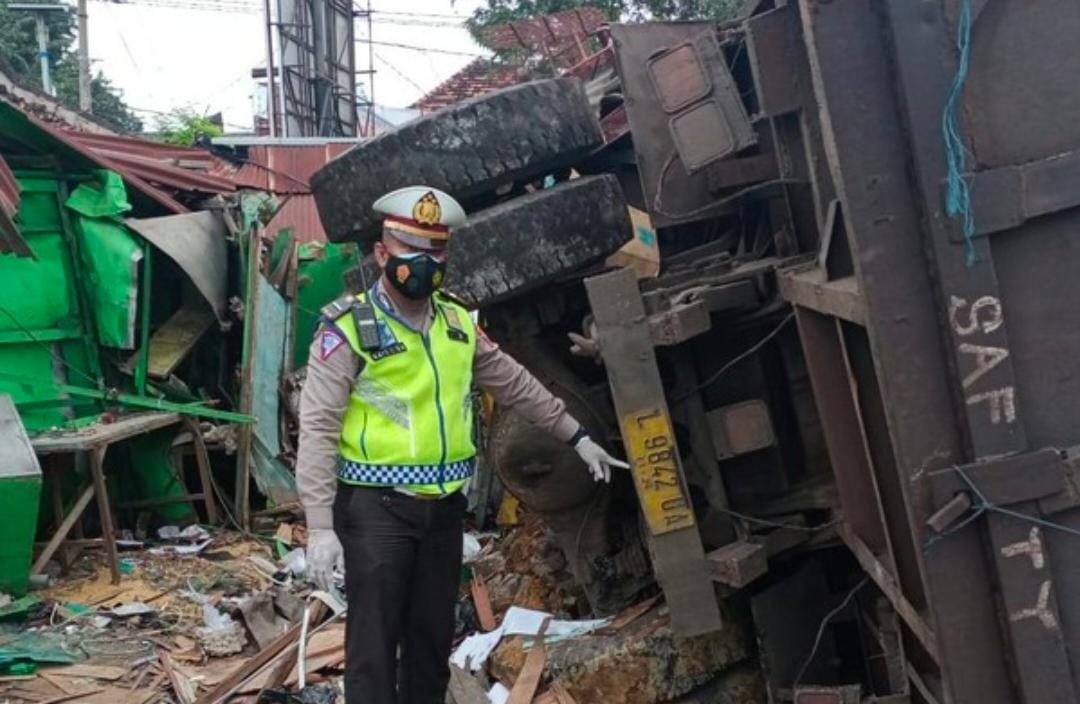 Sesampainya di lokasi kejadian, supir truk mencoba mendahului kendaraan lain yang ada di depannya, namun karena kurang memperhatikan arah dan diduga mengalami rem blong Dum truk itu pun oleng ke kanan hingga menabrak 5 warung.