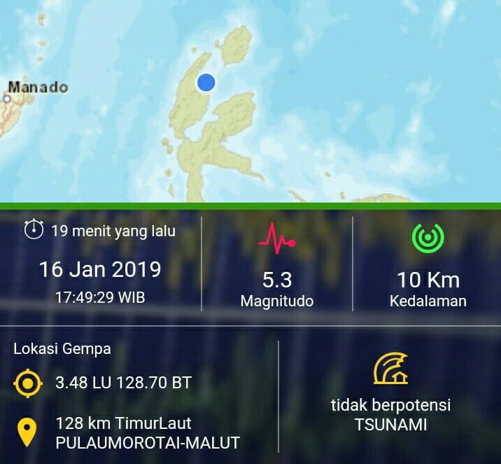 Menurut informasi dari Badan Meteorologi, Klimatologi, dan Geofisika (BMKG) gempa terjadi pada, Rabu (16/1/2019) pukul 17.49 WIB. Lokasi pusat gempa ada dikoordinat 3, 48 lintang utara dan 128,70 bujur timur.