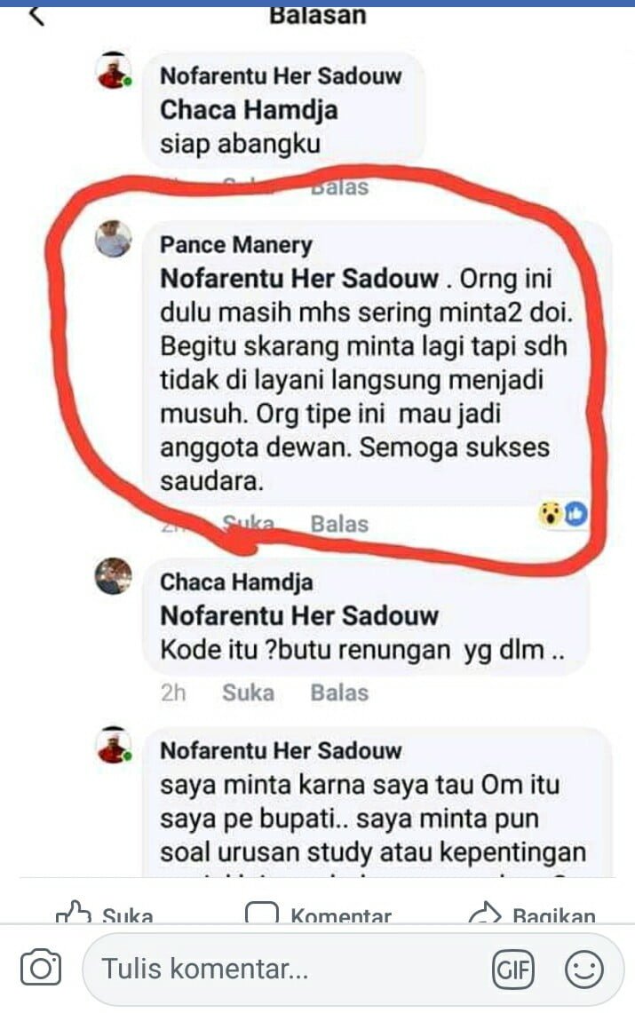 Namun, kemudian Bupati Halut, membalas dengan mengatakan, ‘Orng ini dulu masih mhs sering minta2 doi. Begitu skarang minta lagi tapi sdh tidak di layani langsung menjadi musuh. Org tipe ini mau jadi anggota dewan. Semoga sukses saudara’.