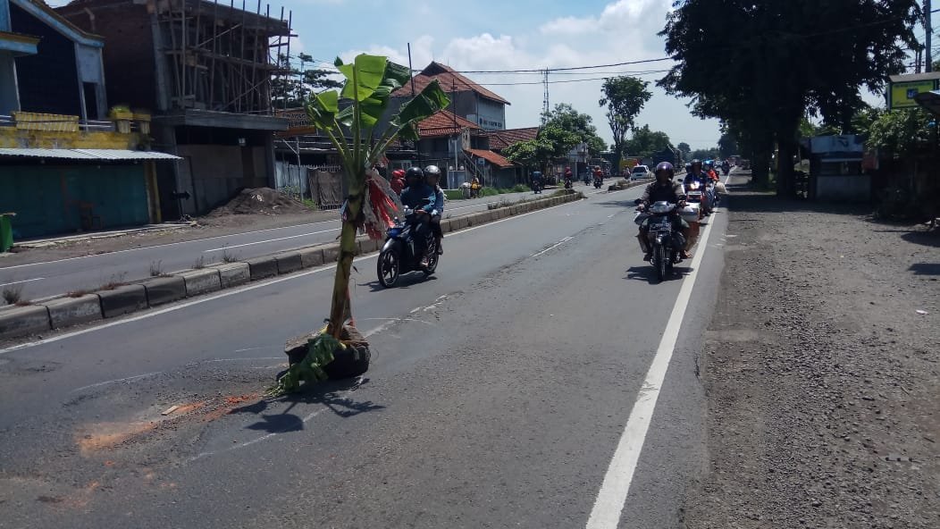 Penanaman pohon pisang ditengah jalan ini menggantikan drum-drum bekas minyak tanah yang dipasang dua hari sebelumnya didepan mini market Annisa sebagai tanda bahaya akibat kerusakan jalan yang tak lebih sebagai anak tiri pasca beroperasinya tol Surabaya-Mojokerto.