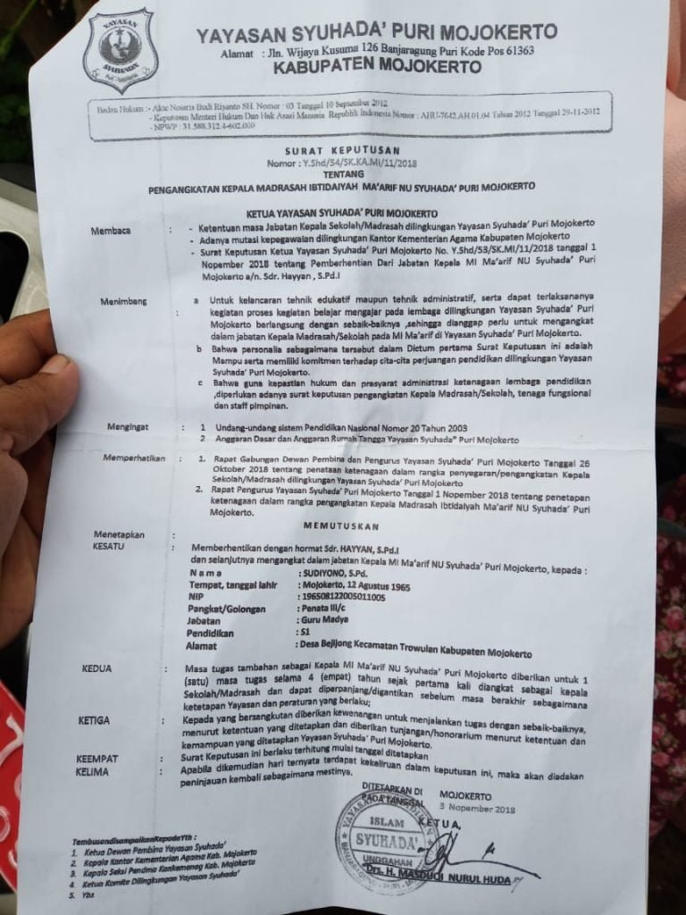 M selaku perwakilan dari walimurid (yang tidak mau disebutkan namanya) menyampaikan bahwa, mereka mepertanyakan tentang Surat keputusan (SK) pemberhentian Hayyan S.pdi selaku kepala sekolah , namun tidak mau turun dari jabatanya, yang sebelumnya sudah ada kepala sekolah yang baru sudiyono S.pd dengan SK nomor y.shd/54/SK.KA.MI/11/2018.