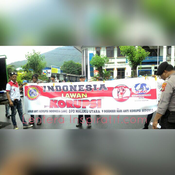 Puluhan mahasiswa yang tergabung dari organisasi Laskar Anti Korupsi Indonesia (LAKI) Maluku Utara, mengelar aksi demonstrasi mementum hari Anti Korupsi Sedunia yang jatuh tanggal 09 Desember 2017. Demonstrasi dilakukan di depan kantor wali Kota Ternate pada, Senin (11/12/2017). Sebab, di Maluku Utara masih banyak kasus korupsi yang belum terselesaikan. Sehingga, puluhan mahasiswa yang tergabung dalam laskar anti korupsi Indonesia, menuntut kepada sejumlah kepala daerah untuk menindaklanjuti kasus korupsi yang belum terselesaikan.