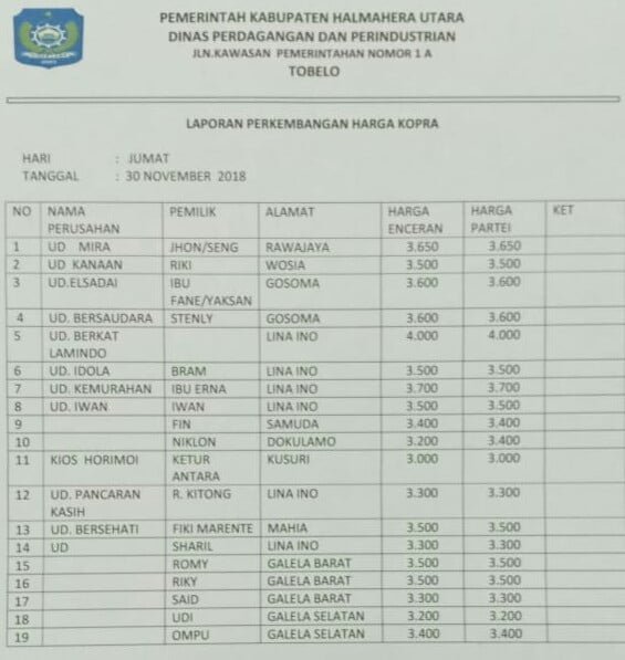 Abdu menambahkan, semenjak dua hari terkahir ini, tepatnya pada hari Kamis (29/11), pihaknya terus melakukan pantuan secara keseluruhan terkait harga kopra di masing-masing Unit Dagang (UD) yang ada di Halut. Dari hasil pantuan sementara ini, diperoleh data bahwa harga kopra di Halut masih bervariasi di setiap UD yang ada, yakni dari harga terendah Rp. 3.300 dan yang tertinggi yaitu Rp. 4.000 perkilo gramnya. “Untuk sementara ini, hasil pantuan kami dilapangan, pada hari ini Jumat (30/11) di semua UD masih bervariasi yaitu paling rendah Rp.3.300 dan paling tinggi Rp. 4.000, “tandasnya. (mc/dit)
