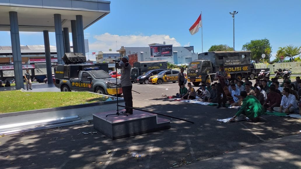 TERNATE – Ratusan massa aksi yang tergabung dalam Aliansi Mahasiswa IAIN Ternate Bersatu yang berunjuk rasa didepan Kantor Walikota Ternate melaksanakan shalat jumat bersama aparat kepolisian, jumat (4/10/2019).