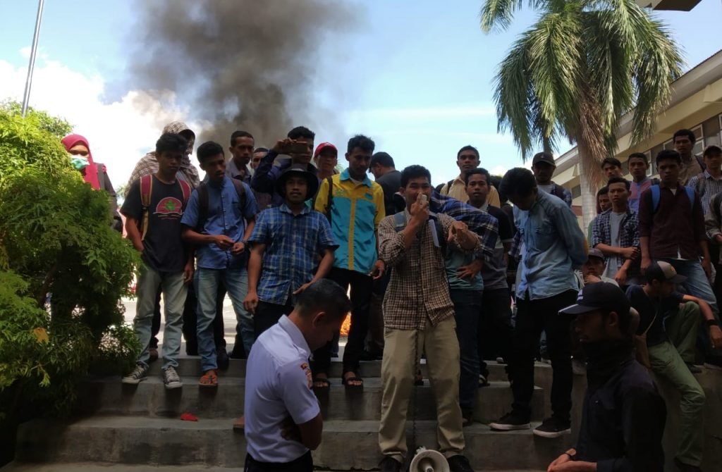 TERNATE – Sejumlah Mahasiswa pasca sajana Institut Agama Islam Negri (IAIN) Ternate, yang tergabung dalam Gerakan Mahasiswa IAIN Ternate menggelar aksi unjuk rasa di depan Kampus IAIN Ternate, Maluku Utara, selasa (10/9/2019).