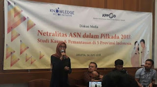 "Dugaan pelanggaran netralitas ASN dalam Pilkada terjadi di seluruh lokasi penelitian. Dengan catatan, ASN membuka diri ke arena politik untuk mendukung kandidat calon. Pelanggaran ini dilakukan oleh ASN yang memegang jabatan mulai dari Sekretaris Daerah, Kepala Dinas, Kepala Desa, Camat, dan Guru, "beber Aisyah, kepada wartawan di Bakoel Koffie, Cikini, Jakarta Pusat, Minggu (24/06/2018).
