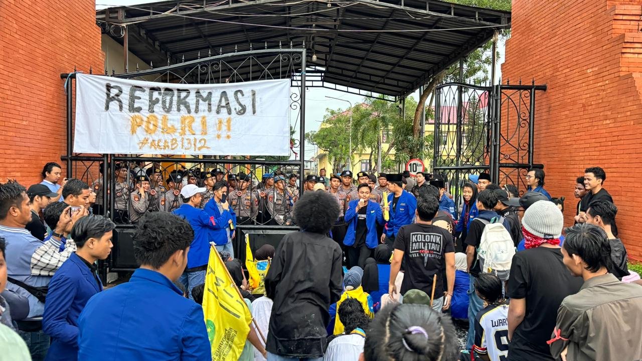 Mojokerto, LenteraInspiratif.id – Puluhan mahasiswa yang tergabung dalam Pergerakan Mahasiswa Islam Indonesia (PMII) Cabang Mojokerto menggelar aksi demonstrasi di depan Polres Mojokerto, Jumat (27/2/2026) mulai pukul 15.00 WIB hingga menjelang Maghrib.