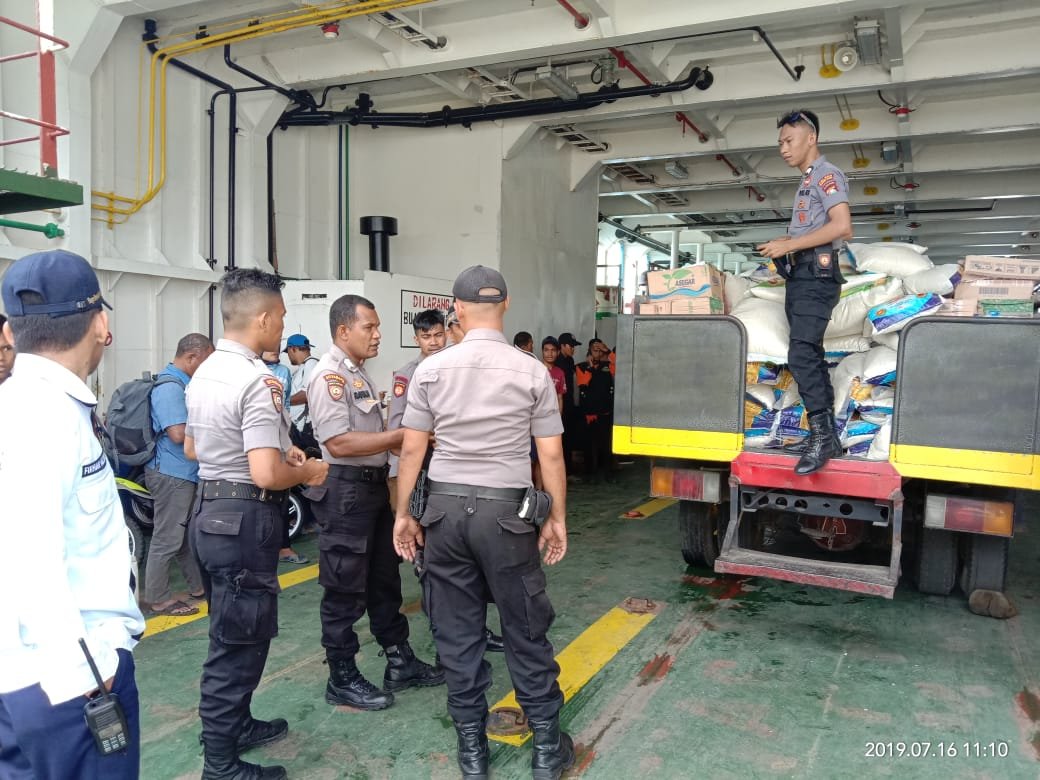 Bahan makanan yang di muat di truck dalmas Polres Halsel kemudian disebrangkan melalui pelabuhan ferry Desa Sayoang menggunakan kapal ferry menuju pelabuhan Desa Saketa, Kec. Gane Barat dan langsung diserahkan ke Posko utama kemudian disebarkan ke pos darurat yang terdapat pengungsian korban gempa.