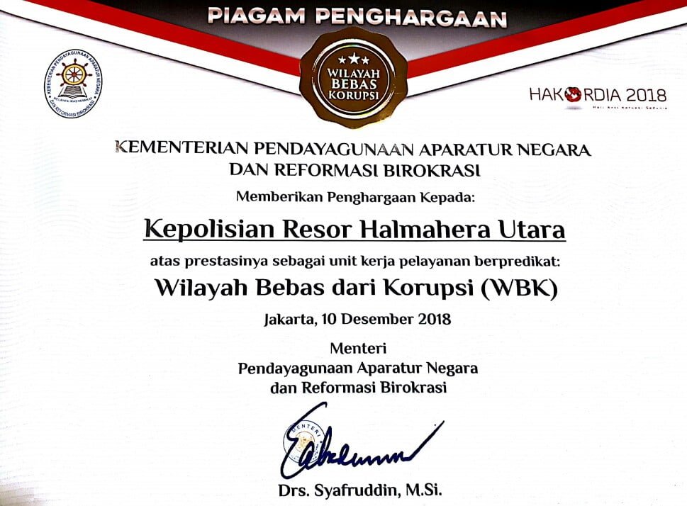 “Semoga penghargaan ini menambah spirit kerja dan motivasi untuk memberikan pelayanan yang baik kepada masyarakat Halmahera Utara. Serta, pihak Mapolres Halut semoga terus beristiqomah dan mawas diri agar terhindar dari perilaku-perilaku yang kurang terpuji, “jelasnya.