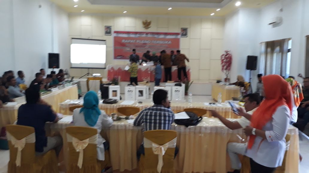 Rapat Pleno Terbuka di pimpin oleh Ibu Saima Nuang S.Sos ( Ketua KPUD Pulau Morotai ),dan di hadiri oleh Takdir Abd.Azis ( Komisioner KPUD Morotai ),Luther Djaguna ( Komisioner KPUD Morotai ),Norison Salawaty ( Komisioner KPUD Morotai ),Irwan Abbas ( Komisioner KPUD Morotai ),Murjad Hi.Untung ( Ketua Panwaslu Morotai ),Seni Soamole ( Komisioner Panwaslu Morotai ),Rasid Do Kader ( Komisioner Panwaslu Morotai ),para ketua dan anggota PPK seKab.Pulau Morotai, Kapolres Pulau Morotai AKBP Mikael P sitanggang, Danramil 1508-05/ Mayor Inf Mulhaman (mewakili Dandim 1508/Tobelo), Dansat Pom Lanud Leo Wattimena Mayor Pom Benyamin Sirait (mewakili Danlanud Leo wattimena), Letda Laut S Alfan (mewakili Danlanal Morotai), Saksi Paslon nomor urut 1 AHM-RIVAI ( Fahri Haerudin dan Mahmud Kiat ), saksi Paslon nomor urut 2 BUR-JADI (Rusminto pawane dan siswandini sibua), saksi paslon no urut 3 AGK-YA (Hendra homole dan mairudin Maende ) dan tamu undangan sekitar 70 orang.