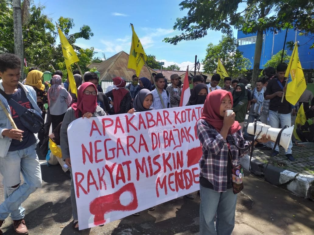 Dalam pantauan awak media lenterainspiratif.com pagi ini, di depan stasiun Radio Republik Indonesia (RRI) Ternate, Maluku Utara, senin (28/10/2019), massa aksi membawakan spanduk bertuliskan ‘Apa Kabar Kota Ternate? Negara Dibajak Oligarki, Rakyat Miskin Semakin Menderita’.