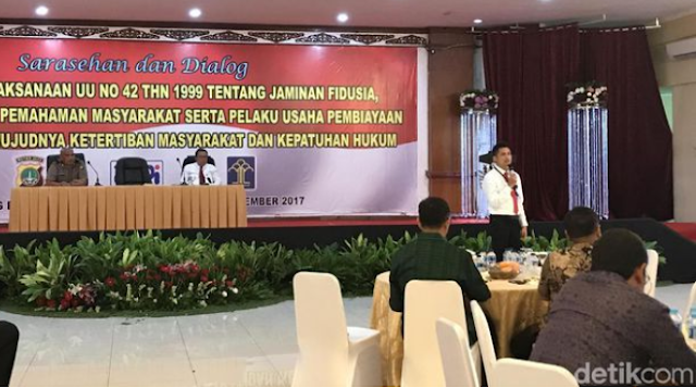 Hal itu diungkapkan Agus seusai acara Sarasehan dan Dialog Optimalisasi Pelaksanaan UU No 42 Tahun 1999 tentang Jaminan Fidusia Guna Meningkatkan Pemahaman Masyarakat serta Pelaku Usaha Pembiayaan dalam Rangka Terwujudnya Ketertiban Masyarakat dan Kepatuhan Hukum. Acara ini dihadiri oleh sejumlah perusahaan pembiayaan yang tergabung dalam Asosiasi Perusahaan Pembiayaan Indonesia, pihak Ditjen Kemenkumham, dan pihak Otoritas Jasa Keuangan.