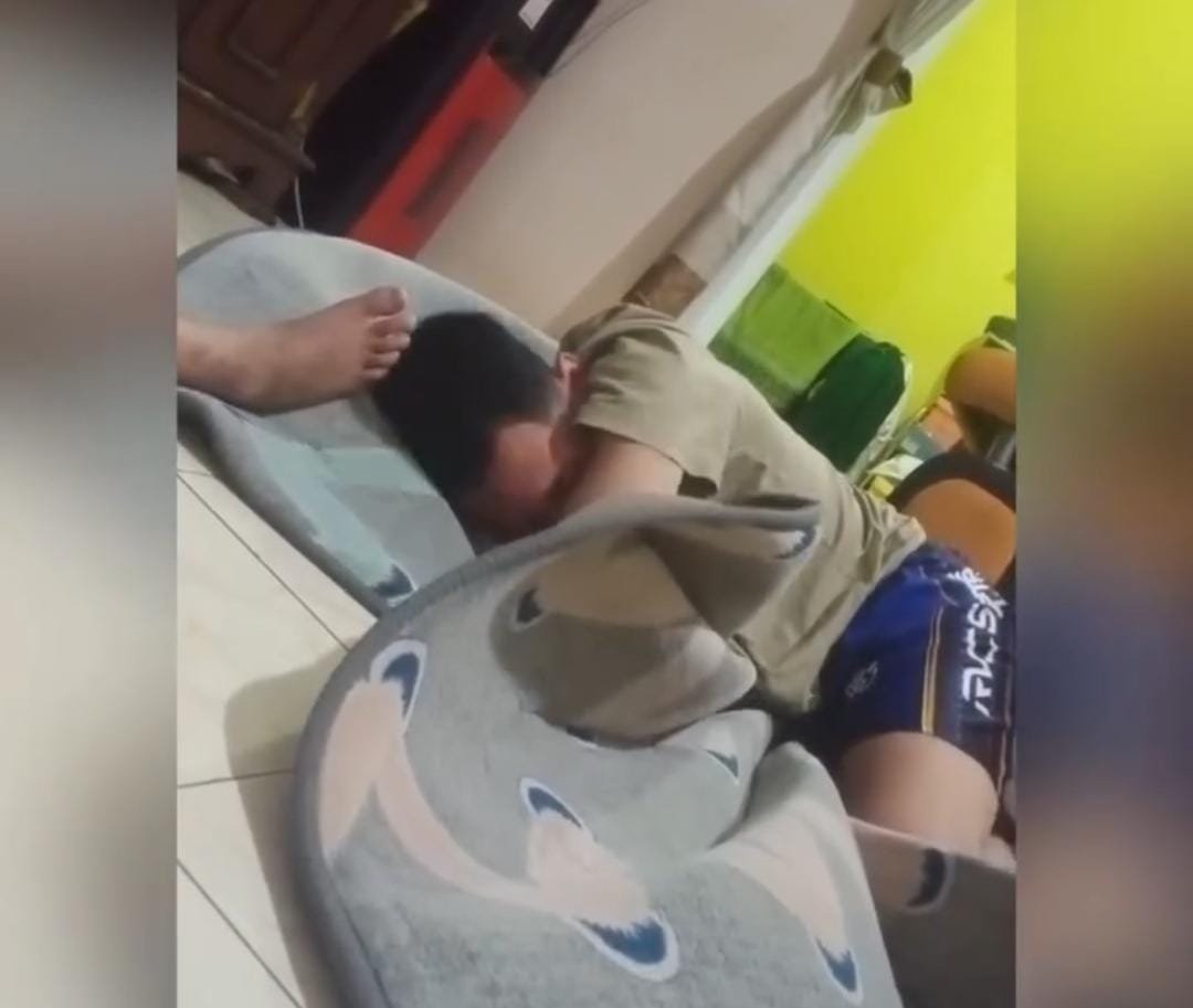 Namun nasihat tersebut justru memicu emosi sang remaja. Ia terlihat duduk di lantai beralaskan karpet sambil menunjukkan sikap kesal karena keinginannya tidak langsung dipenuhi.