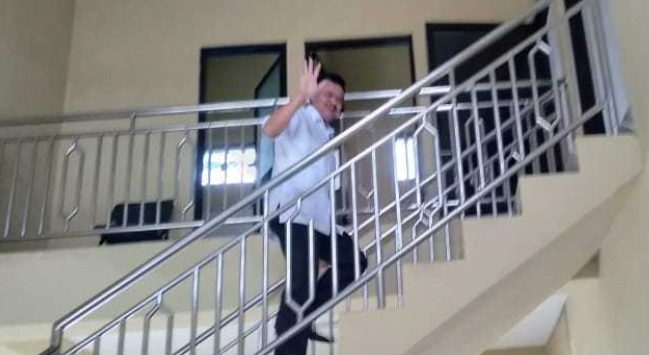 “Shalat dulu, iya ayo,” ajak Wabup pada media saat turun dari tangga, didampingi Kepala Dispendukcapil, Bambang Eko. (her)