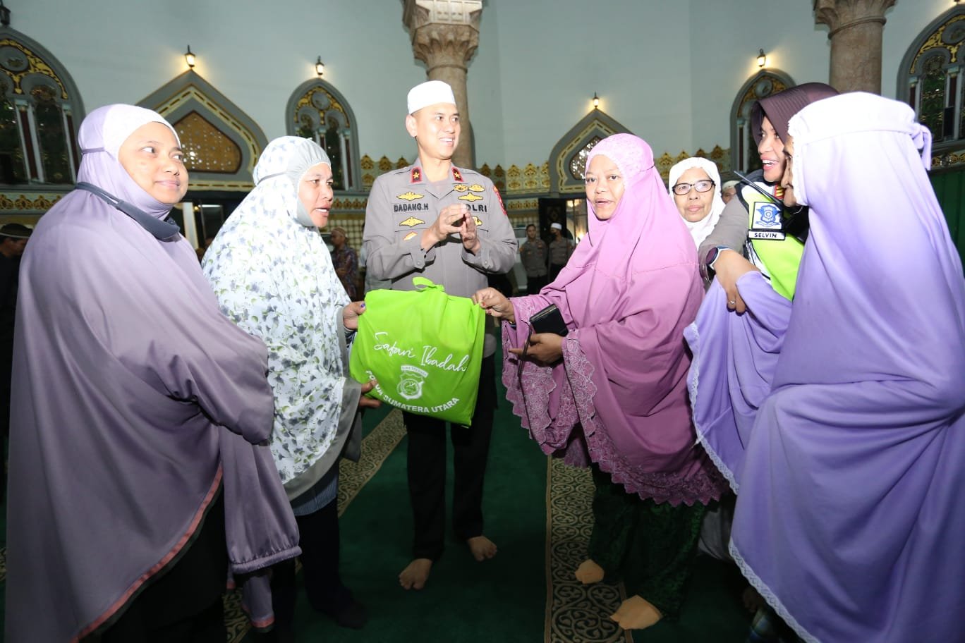 Tidak lupa jenderal bintang satu ini juga memberikan cinderamata berupa mukena serta sembako kepada jemaah Masjid Raya Al Mashun.