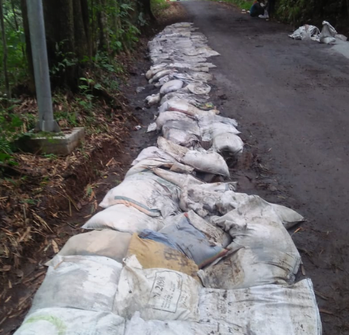 ,” Tumpukan karung berisi limbah itu, dibuang dipinggir jalan sudah lebih dari dua minggu, ketika melewati jalan tersebut pasti mencium bau busuk menyengat apalagi kena air hujan bau busuk dari karung tersebut semakin nampak, ” ungkap misnan warga setempat.