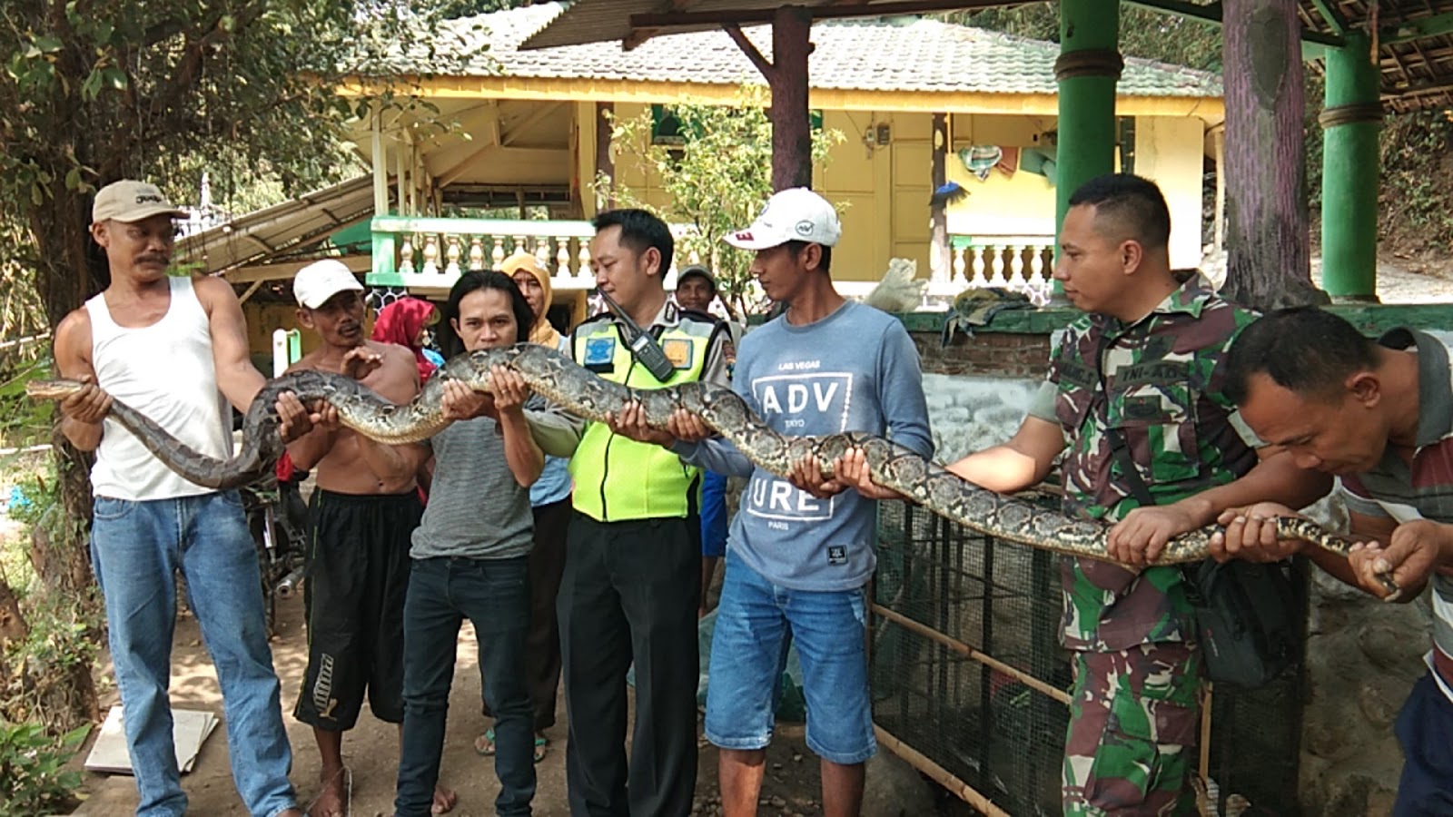 | Warga bersama aparat saat pamer ular raksasa yang berhasil tertangkap |
